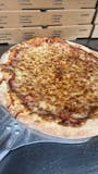 Fresh pizza dough with homemade sauce and cheese provolone and mozzarella. Can also with Feta cheese, black olives, fresh tomatoes on top.